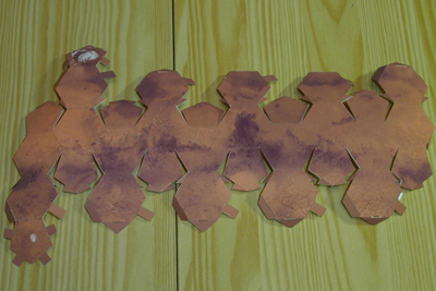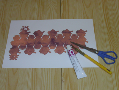 原版の切り出し ハサミやカッターを用いて、原版を外形に沿って切り出します。いささか複雑ですが、一気に切り離そうとせず、無駄なところを切り落としながら進めるのが効率的です。 切り終わったら、折り曲げる部分をカッターの峰打ちやインクの切れたボールペンでスジを入れ、折り目をつけます。 |