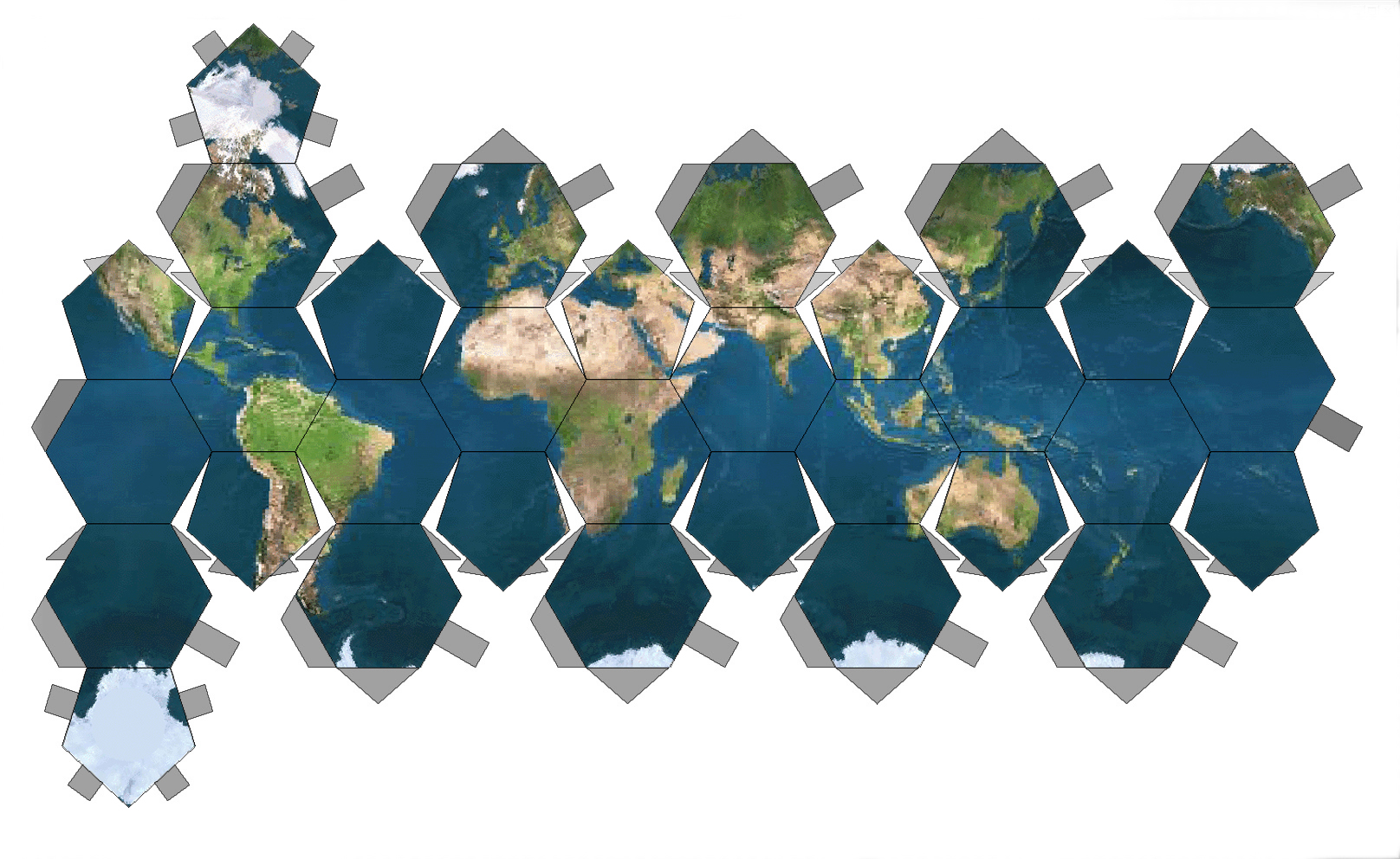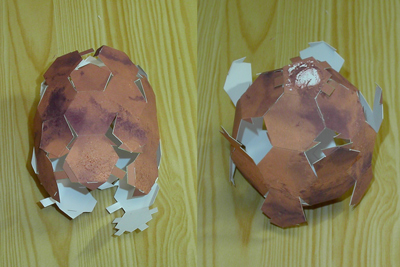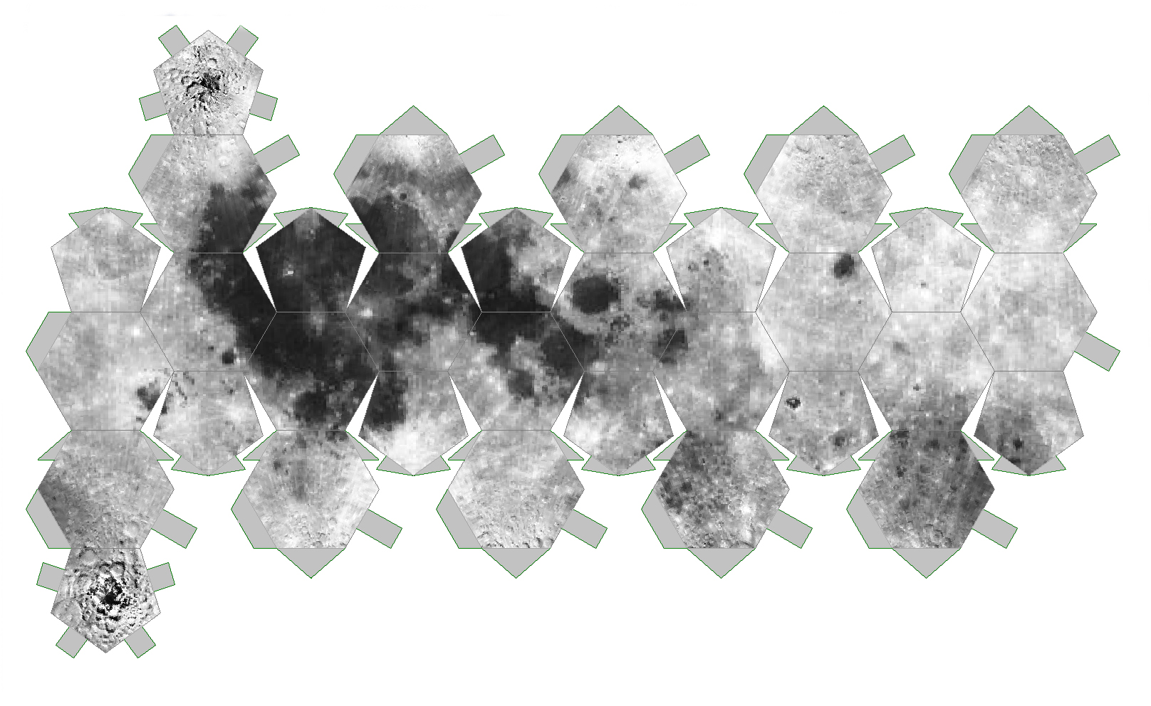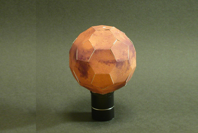 球に組み立てる まず六角形の部分どおしを接着して球にします。ボンドをつけて1つ1つ押さえながら形にしていきます。赤道部分から接着を始めて、最後に北極と南極を接着します 原版では、台形の糊代と差込用のベロを用意しています。ベロを使う場合は、あらかじめ糊しろ台形の下辺の部分に切り込みを入れておいて差し込んでください。速乾性の接着剤を使う場合は、ベロを使用せずに切り離してしまって、糊しろと六角形の裏側を直接貼り合わせても大丈夫です。 すべての六角形を貼り終えたら、次に五角形の部分を折り込んでフタをします。五角形の頂点に出ているツメが噛みあって軽く固定されます。頂点のところに接着剤をつけて固定します。 |