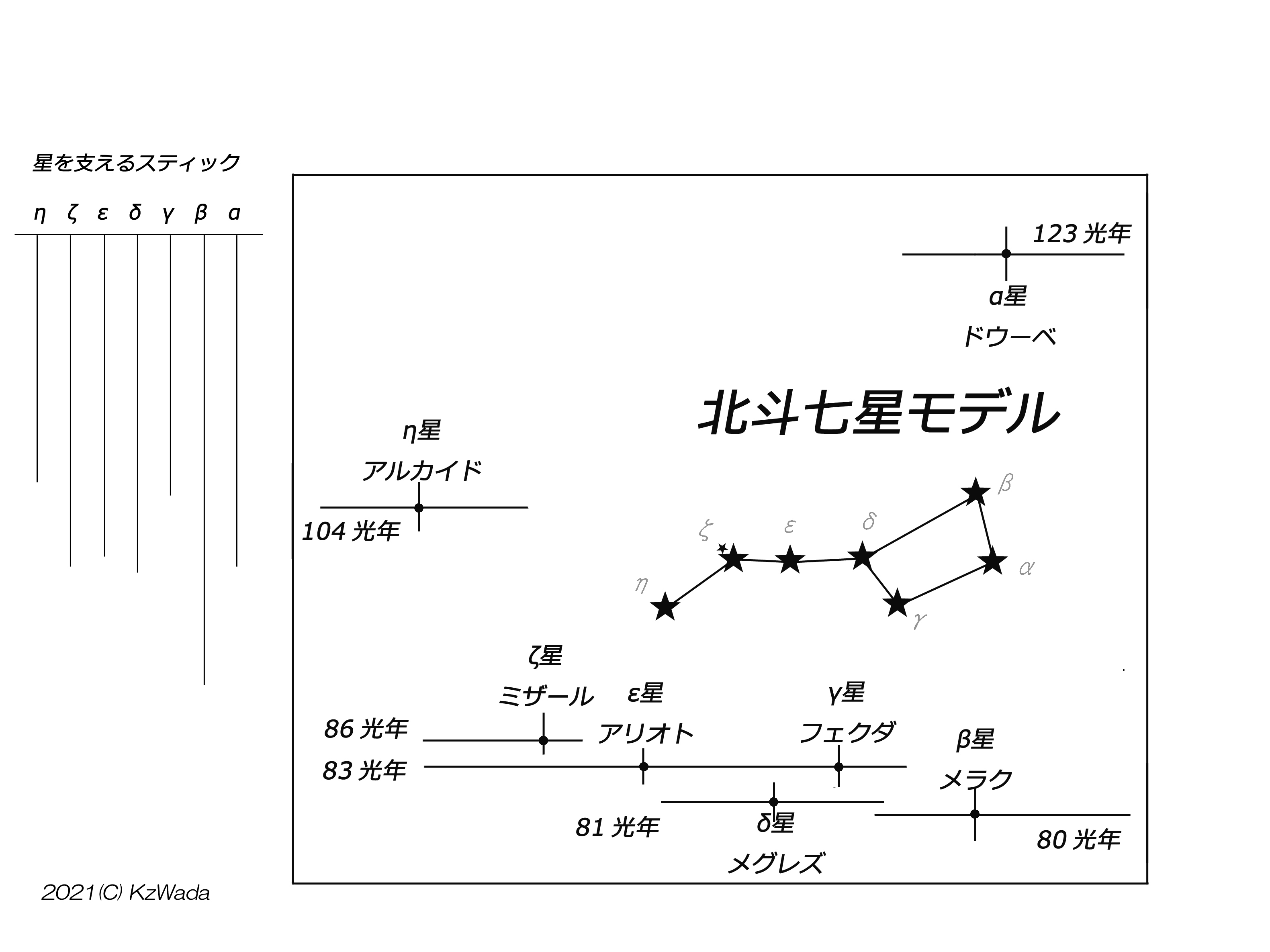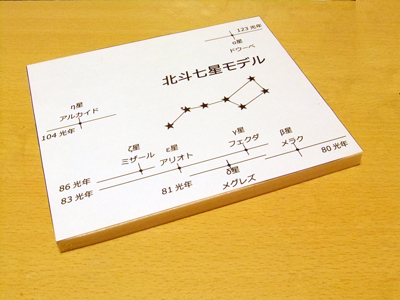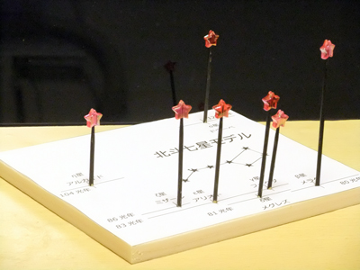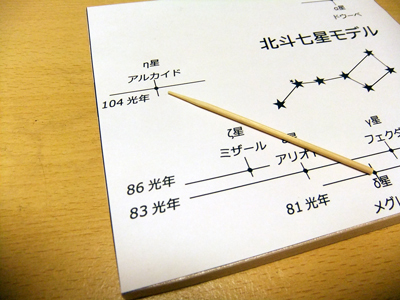 北斗七星は春の夜空を飾るきれいな柄杓の形をつくる7つの星です。この7つの星は、地球からみてそれぞれ異なる距離にあるため、異なった方向から見ると柄杓の形は崩れて全く違う形に見えます。 これを疑似的に体験するモデルを作ってみましょう。 |