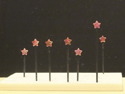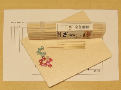 恒星の取り付け 串の先にアクセサリビーズを差し込みます。 作例では、百円ショップでブレスレット等を作るために使う星型のビーズを購入してきて使用しています。 |