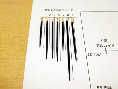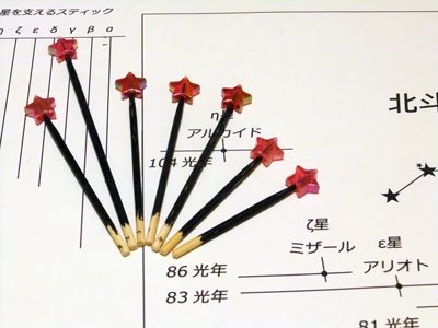 恒星の差込み 順番に注意してそれぞれの恒星を指定の位置に差し込みます。 あとで外れることのないよう、接着剤で根元を固定しておきます。 上からみると星の配置はばらばらですが、真正面から正しい方向から見ると、最初の作例写真のように北斗七星の形をきれいに見ることができます。 |