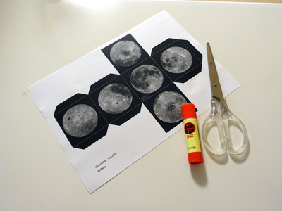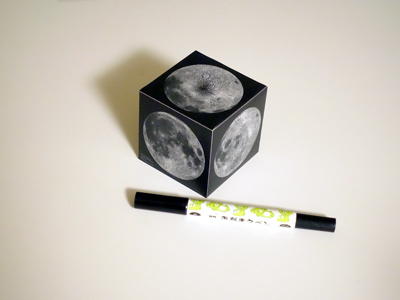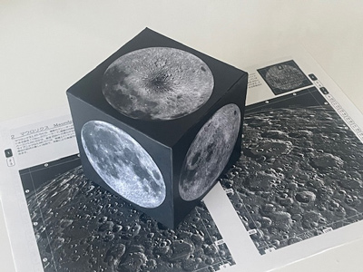 完成です 立方体を手に取って回すと、上下左右表裏からみた月の様子を観察することができます。 月面立法儀の型紙ダウンロード |