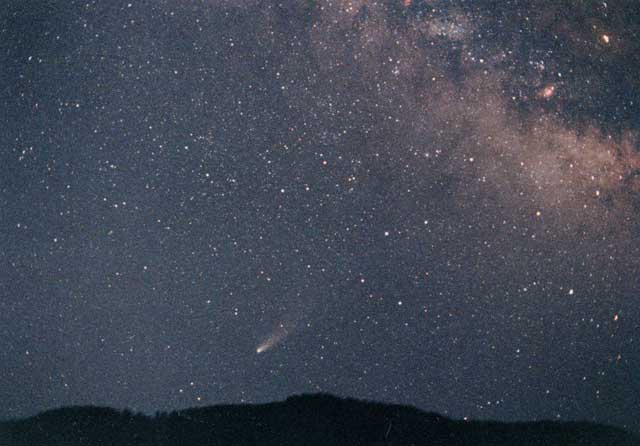 太陽の周りを約76年をかけてめぐるハレー彗星は、過去の出現時の壮大な光景と、ほぼ人の一生に1度の巡り会いに対する憧れから、人々の心を引きつけます。1986年の回帰の際もちょっとしたブームになりましたが、実際には彗星との位置関係が悪く、期待したような勇姿は見ることができませんでした。それでもこの写真を撮影した朝の彗星は、長い尾をたなびかせて天空を渡る姿がとても印象的でした。 |