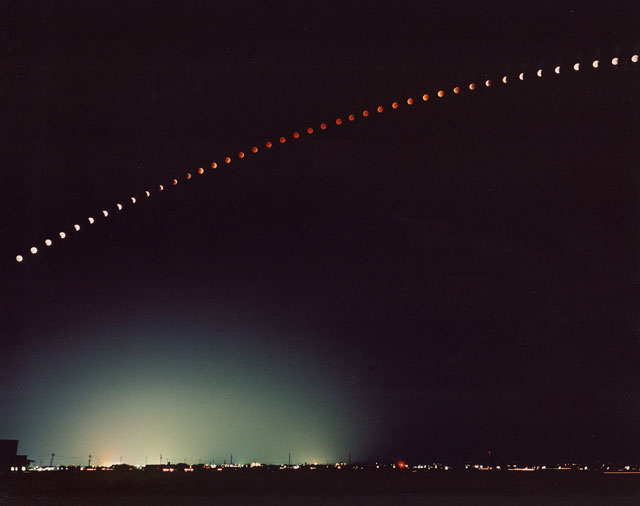 地球の影はほとんど地球と同じ大きさがあるので(月の直径の4倍)その中を月が通過するのには結構時間がかかり、観望は長丁場となります。写真は、定期的にカメラのシャッターを開いて、その経過を連続的に撮影したものです。こんな単調な作業は、とても退屈で、うっかりするとタイミングを外してしまいます。(実は1回だけミスをしているのですが・・・PhotoShopに感謝!)