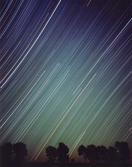 星が天を巡る日周運動の写真は、撮影時間が長ければ長いほどダイナミックな写真になります。しかしながら、撮影の間は雲1つない晴天が続くことと、なにより一晩に撮影できるコマ数がそのぶん減ってしまうので按配は結構微妙です。 これは、西空に沈むオリオン座を2時間30分の露出で軌跡にしたもので、地平線ぎりぎりまで晴れ渡って、期待したとおりの写真になりました。 |