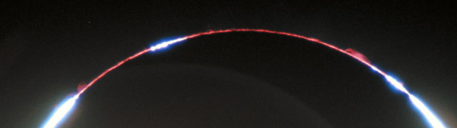 私たちが普段目にする太陽は、黄白色に輝く「光球」というガスの層を見ています。この光球のさらに上層、太陽半径のわずか2%の部分に鮮やかなピンク色に輝くその名も「彩層」と呼ばれる部分があります。研究という観点から言えば、特殊な観測装置を使えばいつも見ることができるのですが、皆既日食や金環日食の始まりや終わりの瞬間、わずか10秒強の間に見られる真紅のアークは、太陽の激しい活動を垣間見るようでとても感動的です。