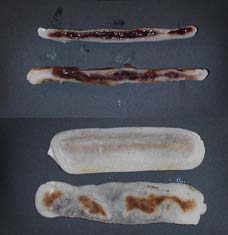中 身なが餅は28g、安永餅は35gで大きさは随分と違います。焦げ目の多い安永餅は少し固め、なが餅は柔らかいのですがいずれも良く伸びるとかモチモチしたというような印象ではありません。あんこも安永餅の方が少し荒めで甘味も抑えられています。見た感じでもわかりますね。 外観のとおり、お味のほうもマスプロのなが餅と素朴さの安永餅でした。 |